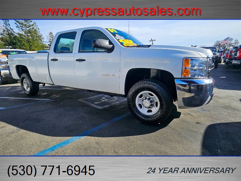 Well now folks we have a rare machine here for you working pleasure. Welcome to our lot, (and possibly your fleet) a 2009 Chevrolet Silverado 2500 Duramax Diesel with the unbeatable Allison transmission, with a crew cab, with a long bed, with a 4x4 drivetrain and with .(..the pièce de ré·sis·tance)..a TommyLift, liftgate. Where are you gonna find a cooler combination in a pre-def, rugged work truck? Well here at Cypress Auto Center, of course! Powering this versatile machine is the Duramax diesel engine (LMM) which produces 365 horsepower at 3,200 rpm and 660 lb-ft of torque at 1,600 rpm. Harness this power for everyday tasks making your workday a breeze. This 2009 Silverado 2500 has an easy clean interior with vinyl flooring and cloth front and rear bench seating. Added to the basic features of this truck are an AM/FM stereo with CD player, cruise control, tilt wheel, power door locks, spray on bedliner, tow hitch and wiring, trailer brake, ice cold air conditioning, a warm and fuzzy heater. The TommyLift lift gate works like a dream...( it held up nicely when I rode up and down on it!) This marvel of engineering comes fresh off US Government fleet service use out of the Lancaster CA.. quite possibly this was used around Edwards and has seen some Space mission action. We refreshed the fluids, replaced tie rod end, ball joints sent if off to the spa for a spruce up and now it's ready to find a new assignment. Come on down, take this for a spin, and then take it home...this one will sell fast!