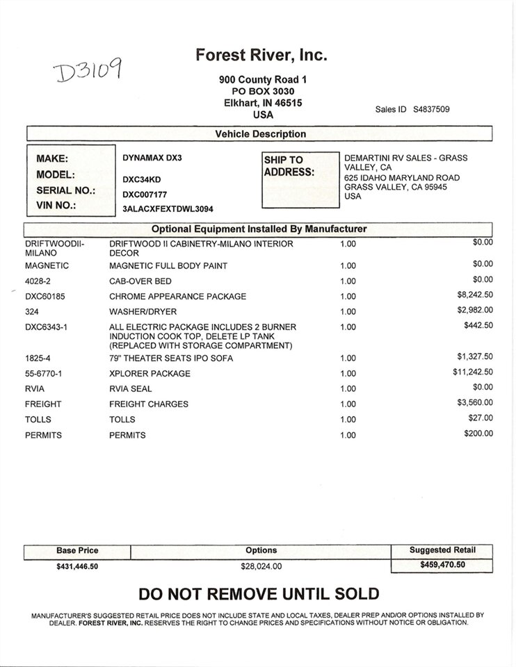 2026 Dynamax DX3 34KD with Xplorer Package Double Slide-Out Class Super C Diesel Motorhome. The DX3 emanates a legendary level of power, prestige, and precision. It turns heads with its impeccable paint schemes and eye-catching curb appeal. A look under the DX3’s hood reveals an impressive powerhouse that showcases the Cummins 8.9L 360 HP engine and the Allison 3200 TRV automatic transmission, resulting in remarkable torque (1,150 lb.-ft.) and towing capacity (20,000 lbs.). All this power and performance is perfectly matched with a living space that exceeds expectations.The MSRP is over $459K, but we're slashing it down too low to advertise! Contact us for our LOWEST Price! Item #D3109 DeMartini RV Sales