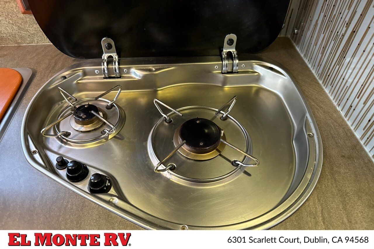 The kitchen is a highlight of the Navion 24G, featuring a modern, efficient layout. It includes a two-burner cooktop, a convection microwave, and a refrigerator that offers ample space for food storage. The solid surface countertops provide both functionality and style, with plenty of prep space for meal preparation. The kitchen is equipped with a stainless steel sink and a high-arc faucet, making cleanup a breeze.