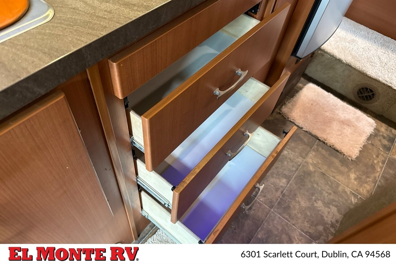 Step inside the Winnebago Navion 24G, and you’ll be greeted by a thoughtfully designed interior that maximizes space and comfort. The interior features a warm and inviting color palette, complemented by high-quality materials that create a cozy atmosphere. The well-appointed living area includes a slide-out that expands the space significantly, providing room to relax and entertain.