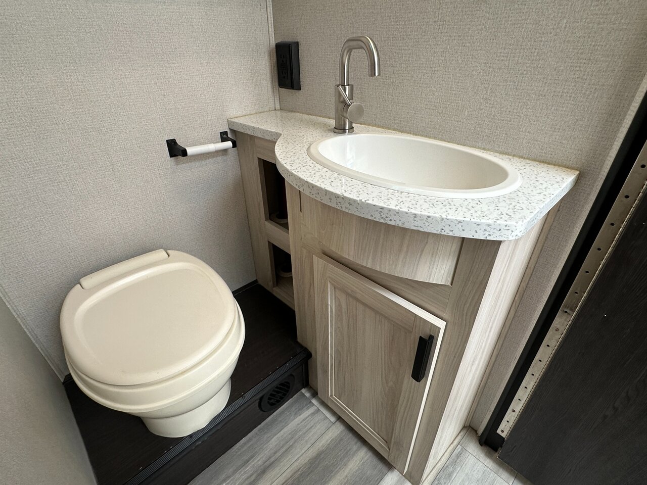 Porcelain toilet and vanity with solid surface counter