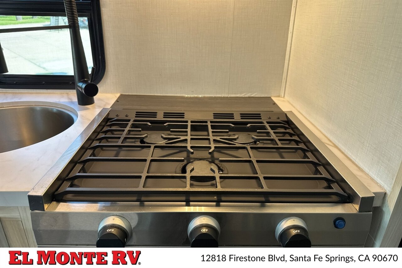 - Full galley designed for extended travel: three-burner cooktop, a range or range-top cover for added counter workspace, and a kitchen microwave/oven combination to handle meal prep with convenience.