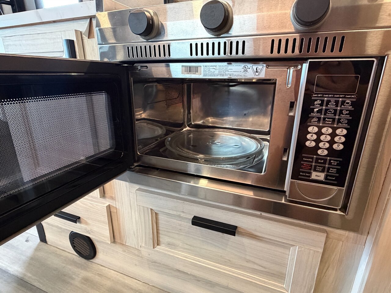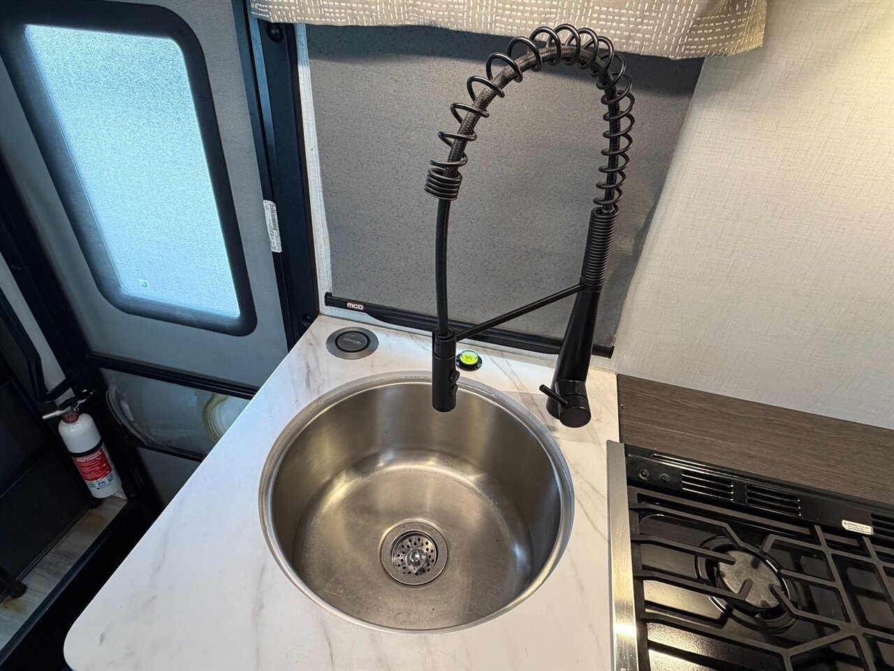 Modern kitchen: 12V refrigerator, cooktop, convection microwave, flip-up counter extension