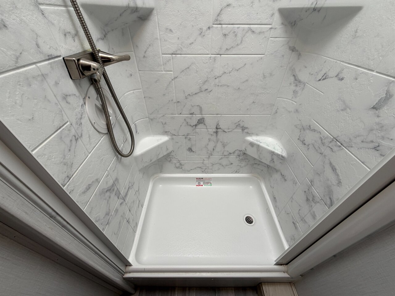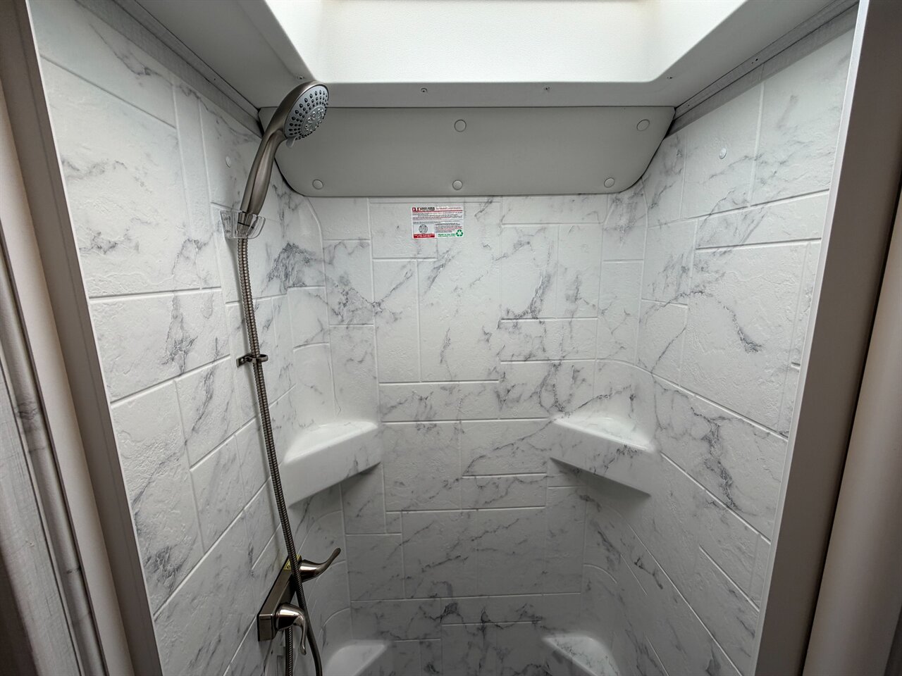 Comfortable bath: 24" x 32" shower with skylight for natural light