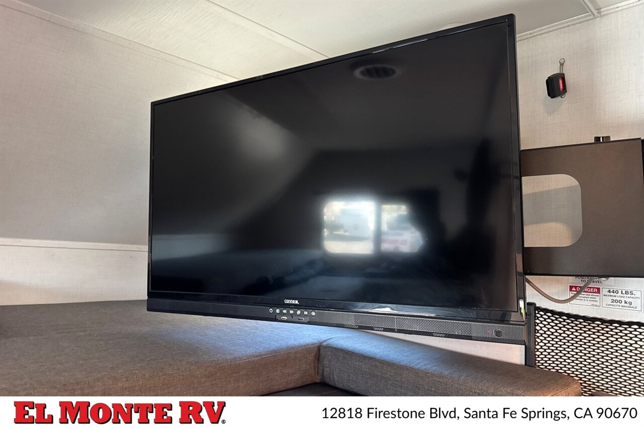 The Sunseeker 2860DS features a durable exterior with multiple compartments for pass-through storage, weather-sealed doors, and a power-operated patio awning with integrated LED lighting for evening use. Slideouts are factory-equipped with reliable electric mechanisms and exterior skirt protection to maintain a tight seal and smooth operation. A factory-mounted ladder provides roof access for servicing, and the roof is finished with a reinforced, easy-to-maintain membrane. Exterior utility connections include 30-amp shore power inlet, city water connection, cable/satellite hookup, and a lockable LP service door. An exterior shower and dedicated quick-connect fittings for outdoor appliances are included on the factory sheet.