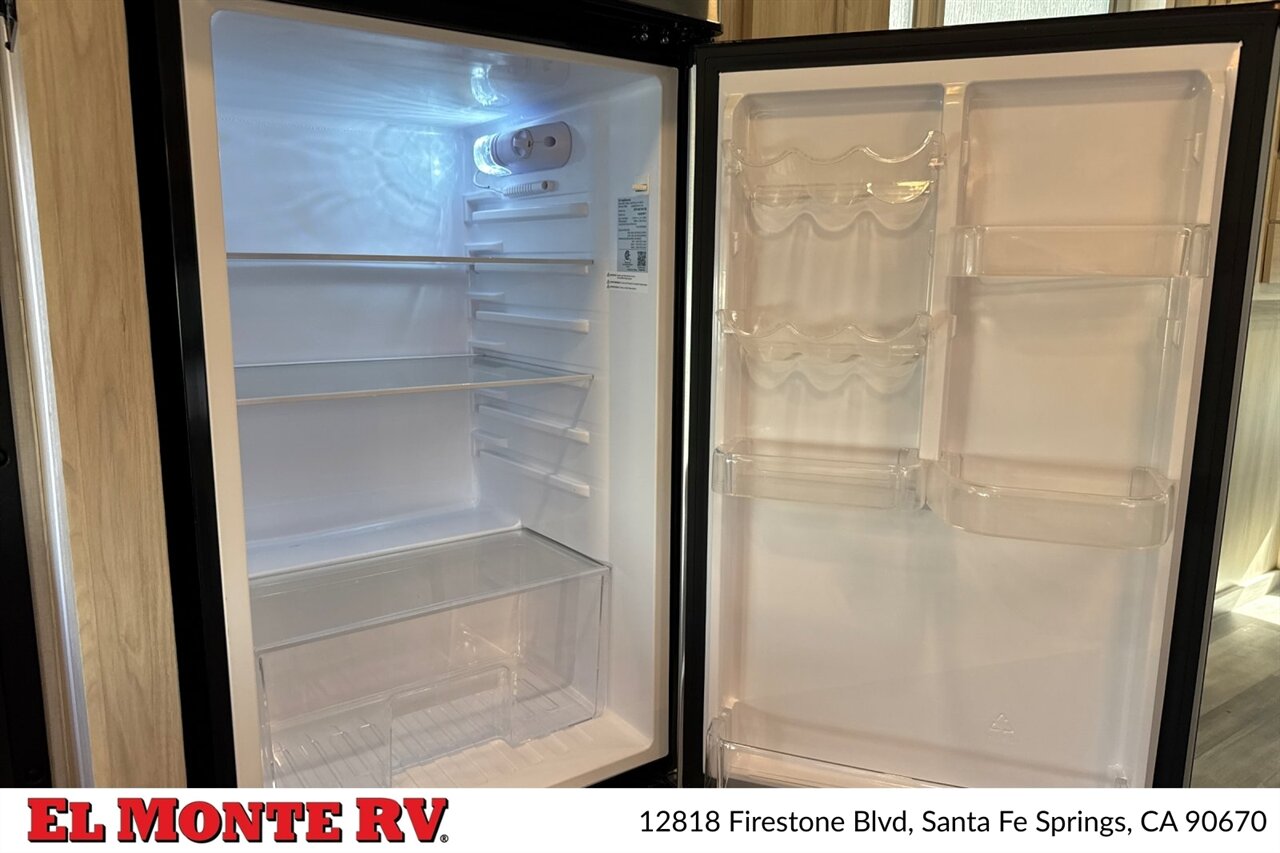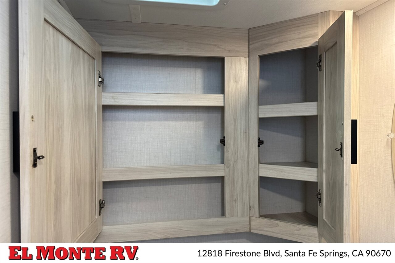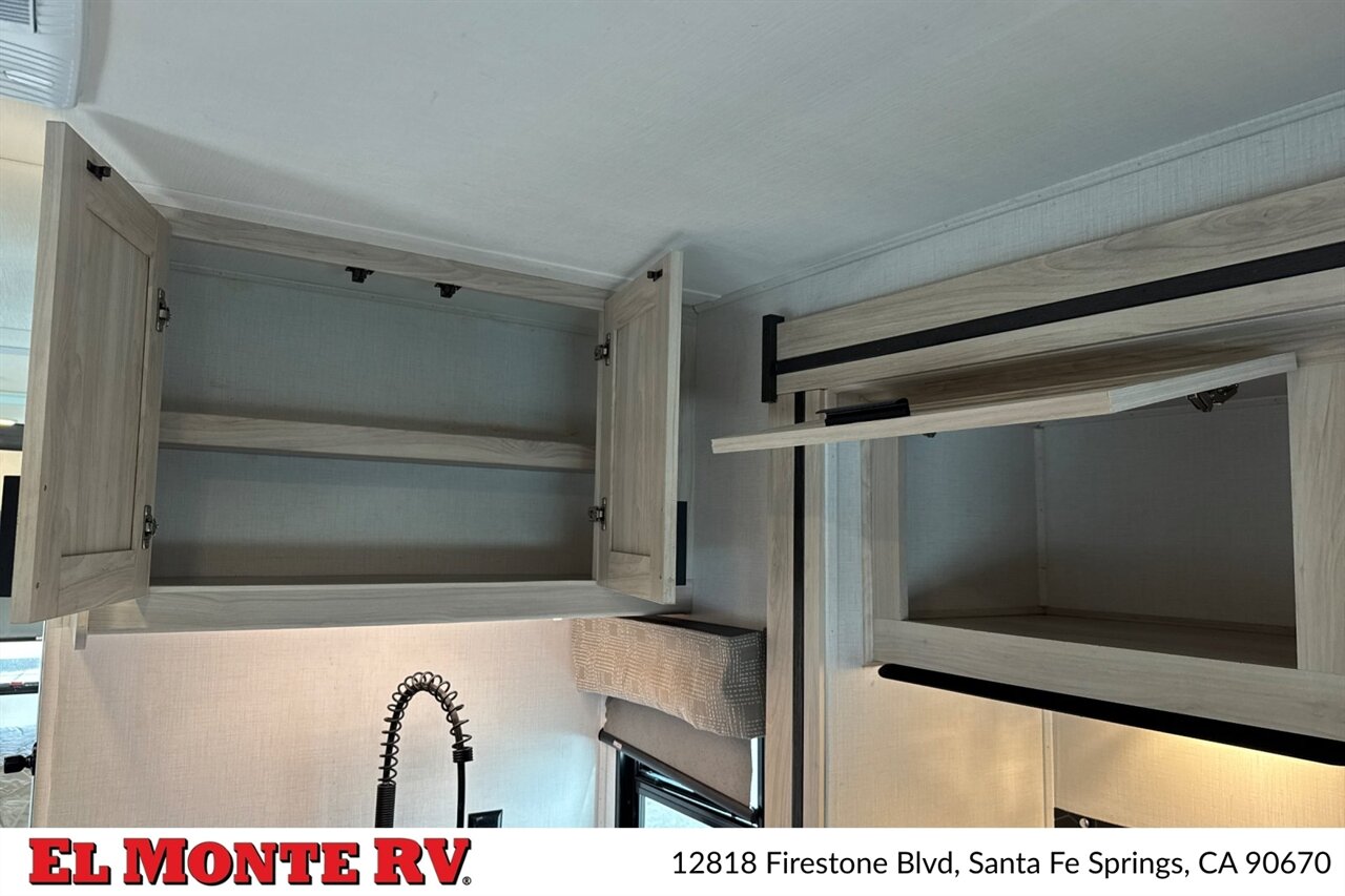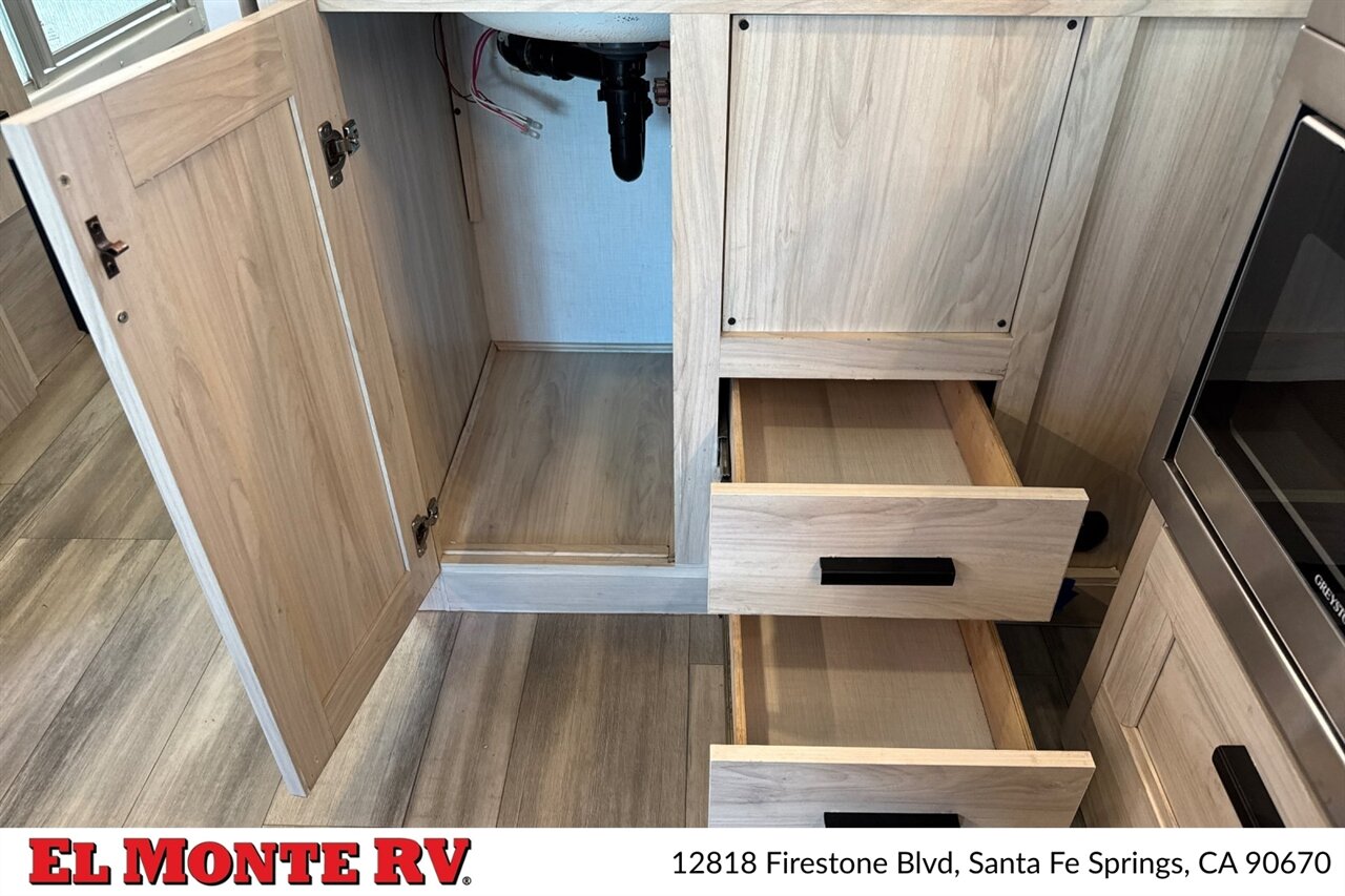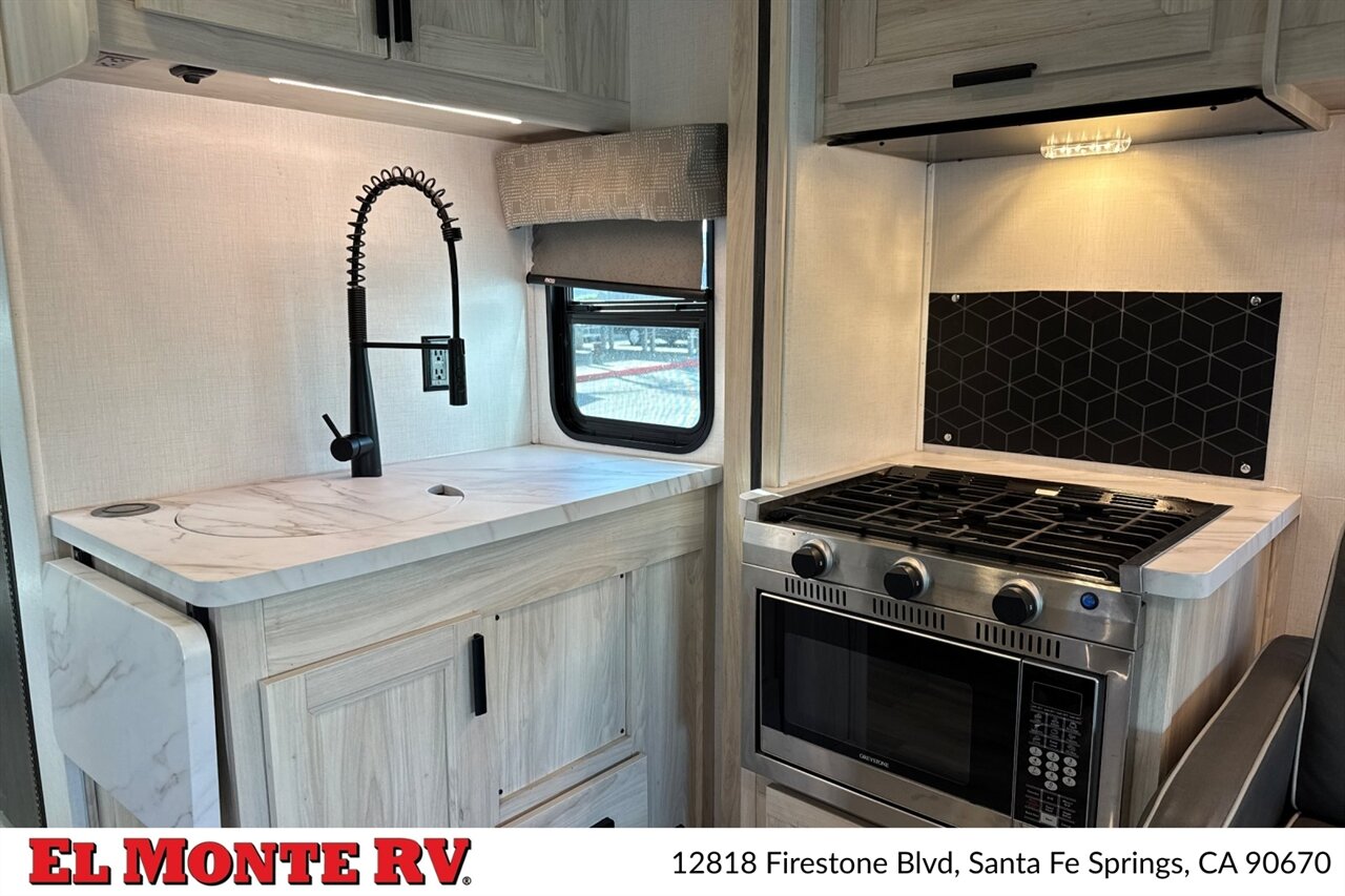 The galley is equipped with factory-standard appliances designed for on-the-road meal preparation. This includes a multi-burner cooktop with a sealed stovetop cover, a convection microwave or microwave/hood combination for warming and quick cooking, and a refrigerator/freezer sized for extended trips. The stainless-steel sink(s) feature a high-rise faucet, and counterspace is enhanced with covers or slide-out countertop extensions depending on the factory package. Cabinets and drawers include full-extension ball-bearing slides and organizational features for utensils, dinnerware and dry goods.