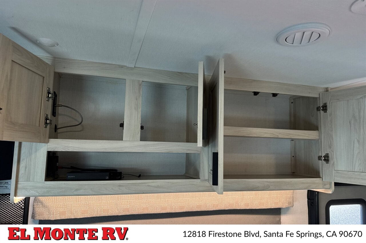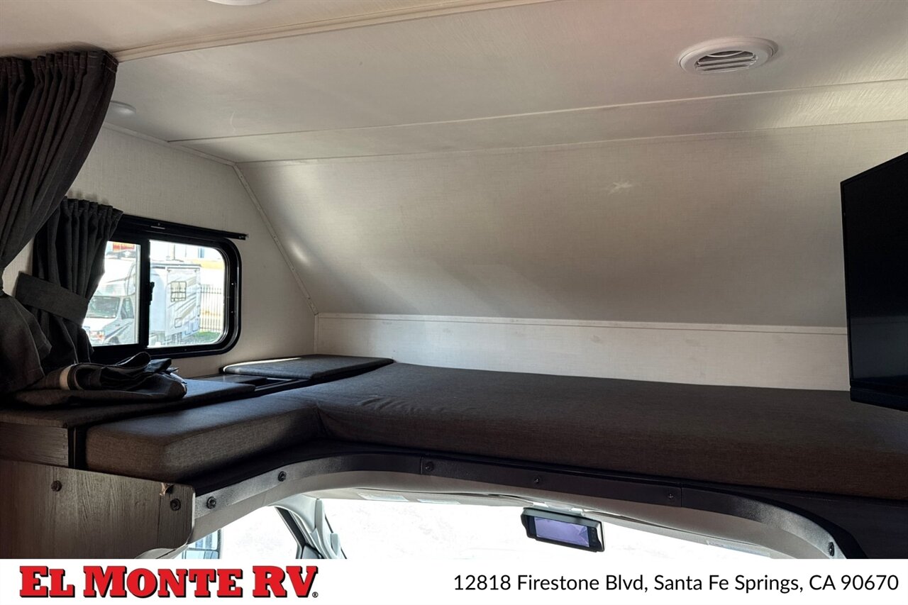 Interior finishes reflect Forest River’s standard specification for the Sunseeker series: durable wood cabinetry with raised-panel doors, well-appointed countertops, and designer upholstery. The dual-slide configuration expands the living and sleeping areas to create an open, comfortable interior. LED ceiling lighting and accent fixtures provide bright, energy-efficient illumination. Windows are fitted with day/night shades that offer privacy and light control while maintaining a streamlined appearance.