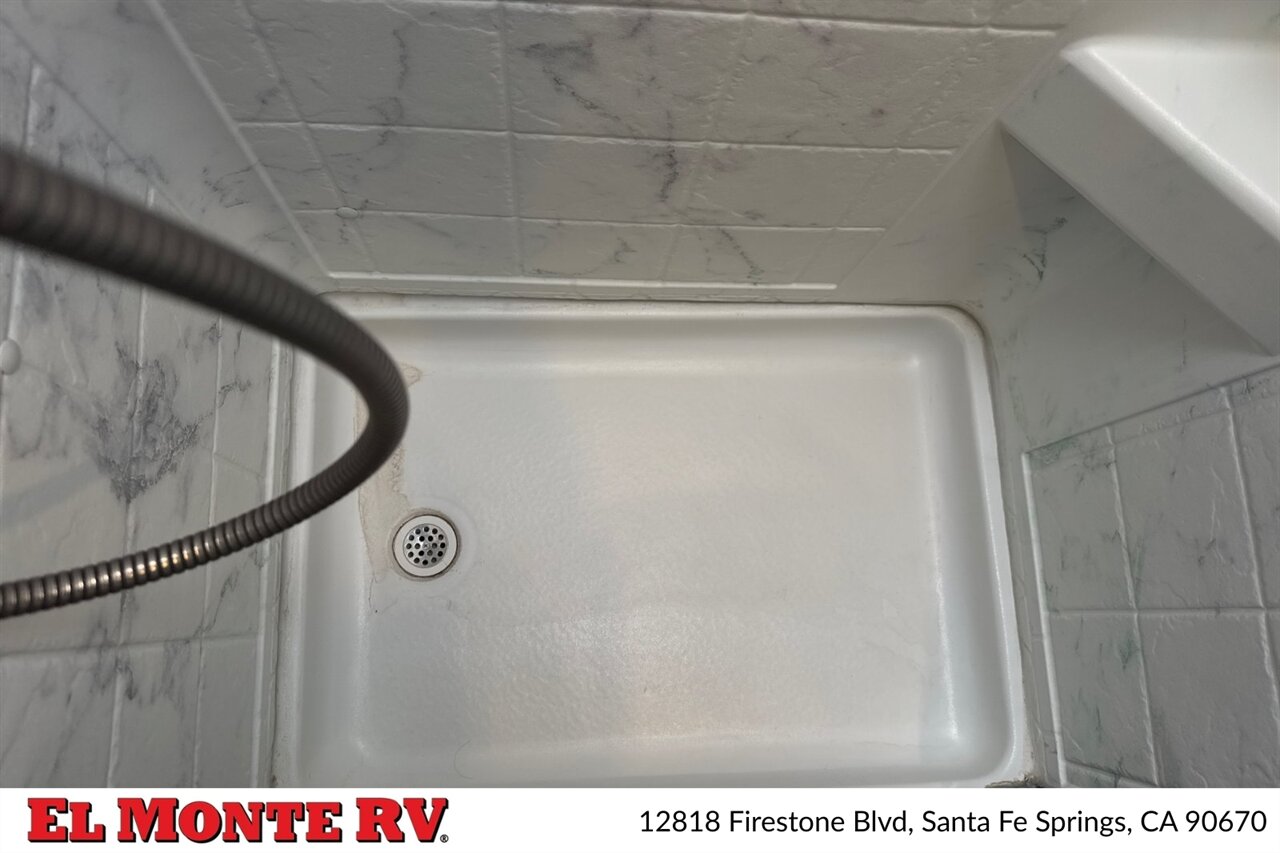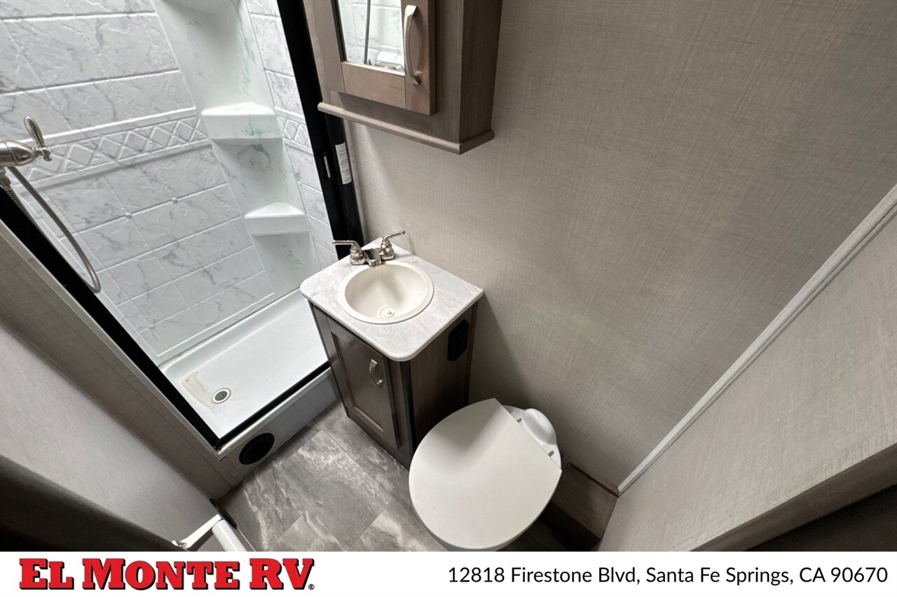 The bathroom in the 2024 Gulf Stream Conquest 6238 is designed for both functionality and comfort. It features a spacious shower with a glass door and a skylight for added natural light. The bathroom also includes a foot-flush toilet and a sink with a medicine cabinet above, providing ample storage for personal items.