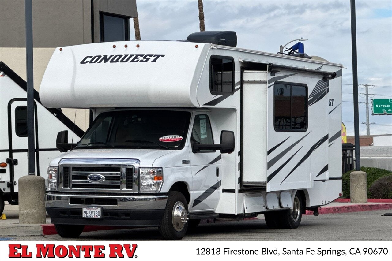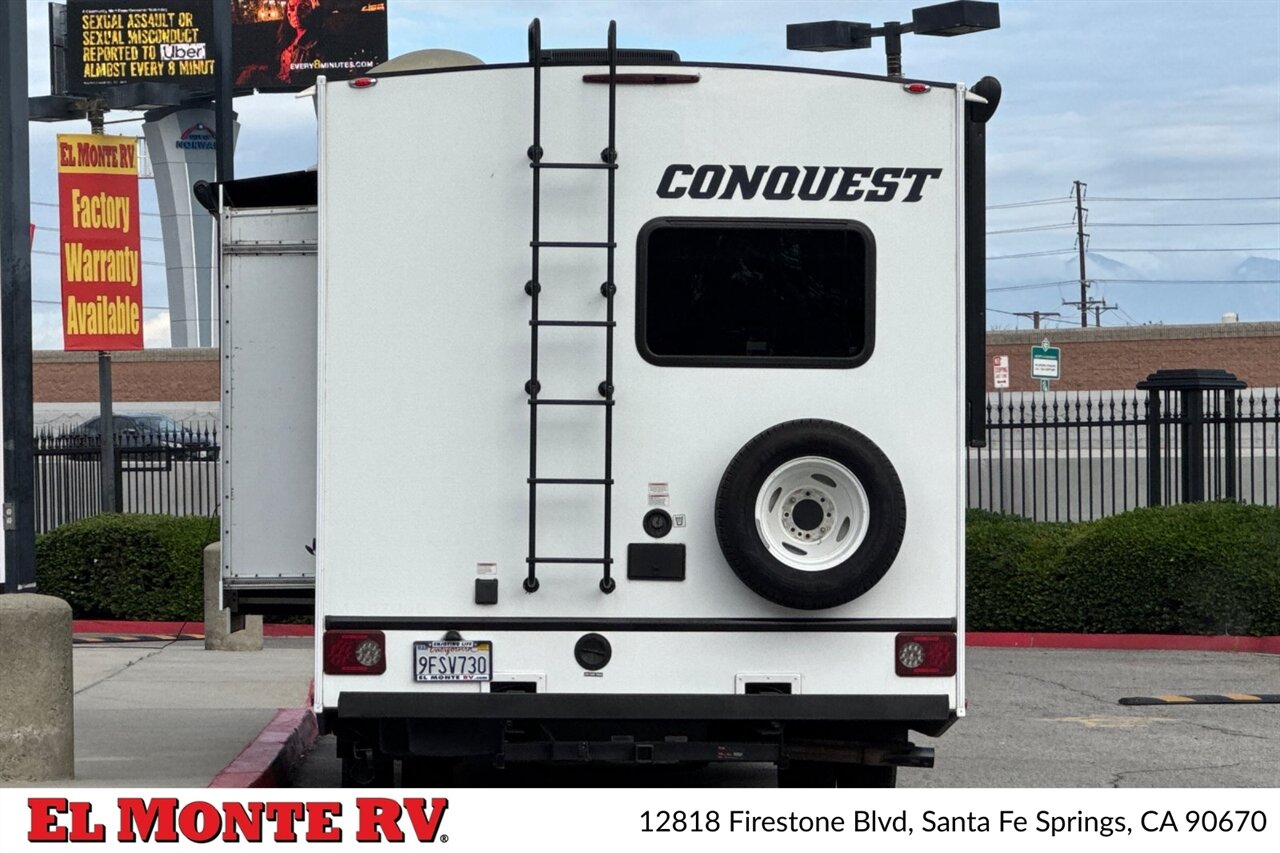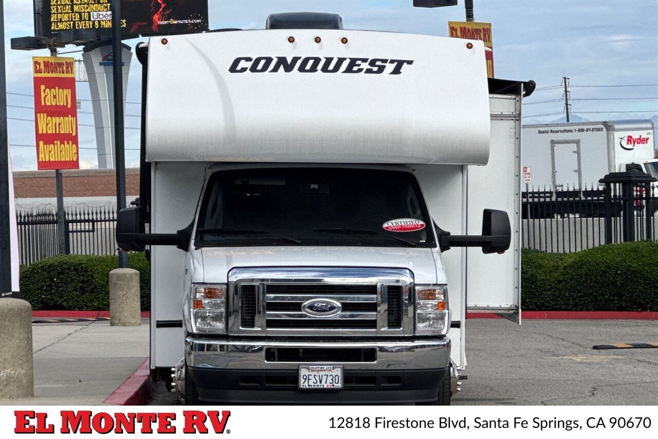 A high-quality fiberglass front cap provides both style and protection against the elements. The exterior is adorned with a striking graphics package that adds a touch of sophistication. The Conquest 6238 comes equipped with a power awning with LED lighting, creating a perfect outdoor living space for relaxation and entertainment. Additionally, the motorhome features ample exterior storage compartments, ensuring you have all the space you need for your travel gear.