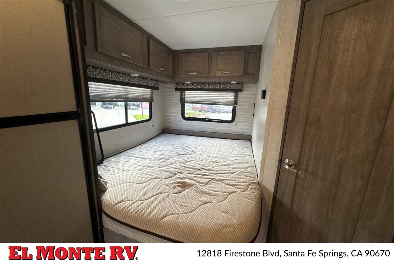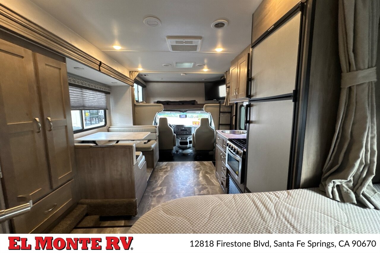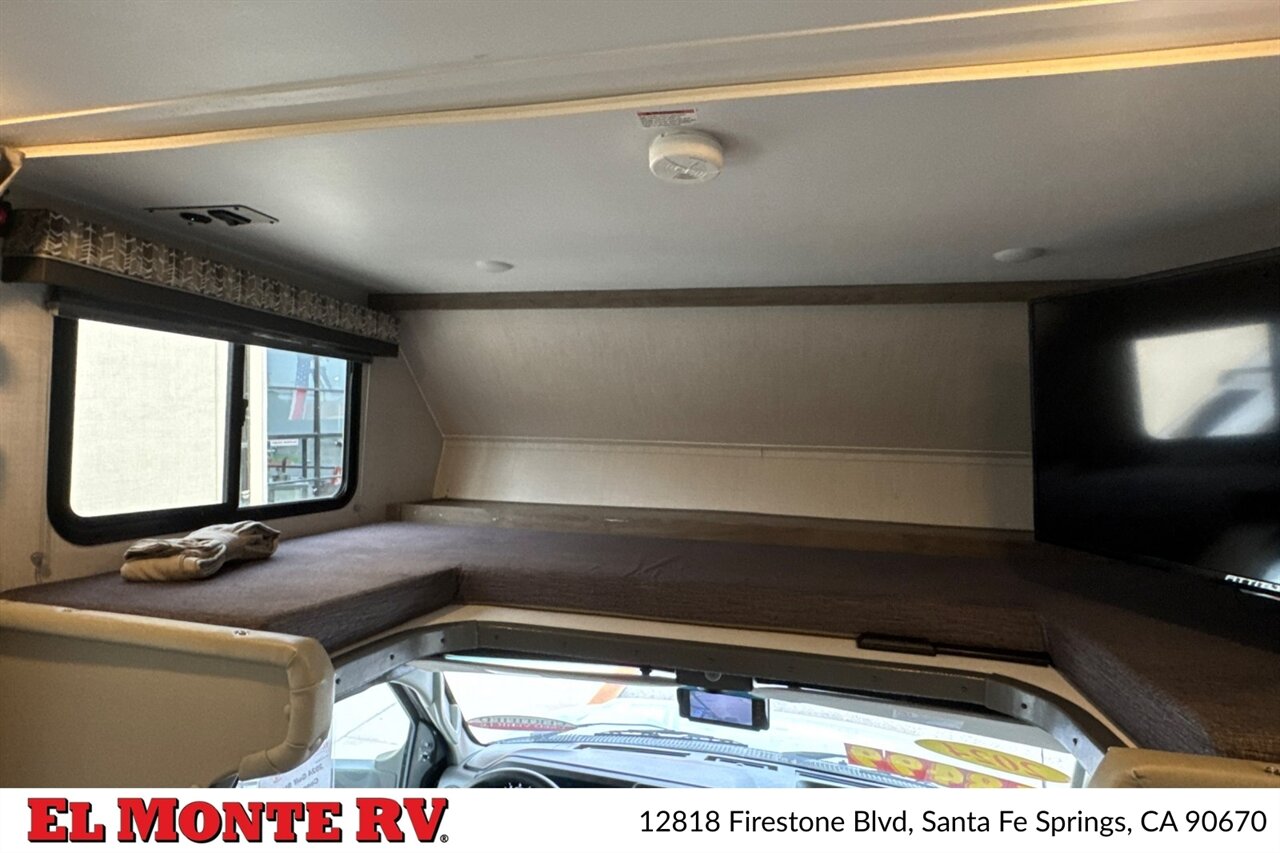 The motorhome features a comfortable cab-over bunk area that provides additional sleeping space for guests or children, along with a 60” x 80” queen bed in the master bedroom. The living area includes a cozy sofa that can be converted into a bed, and the booth dinette offers a comfortable place to dine while also converting into additional sleeping space if needed.