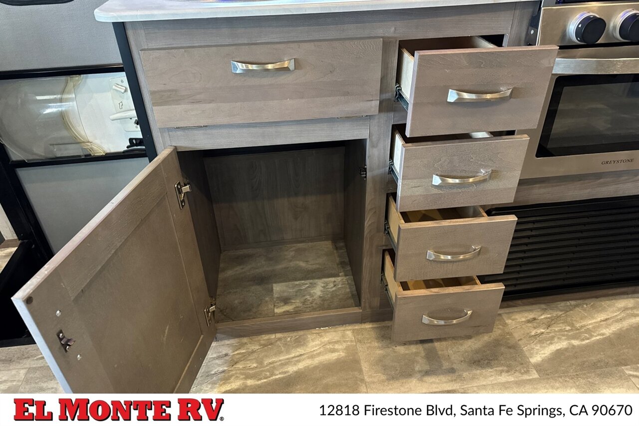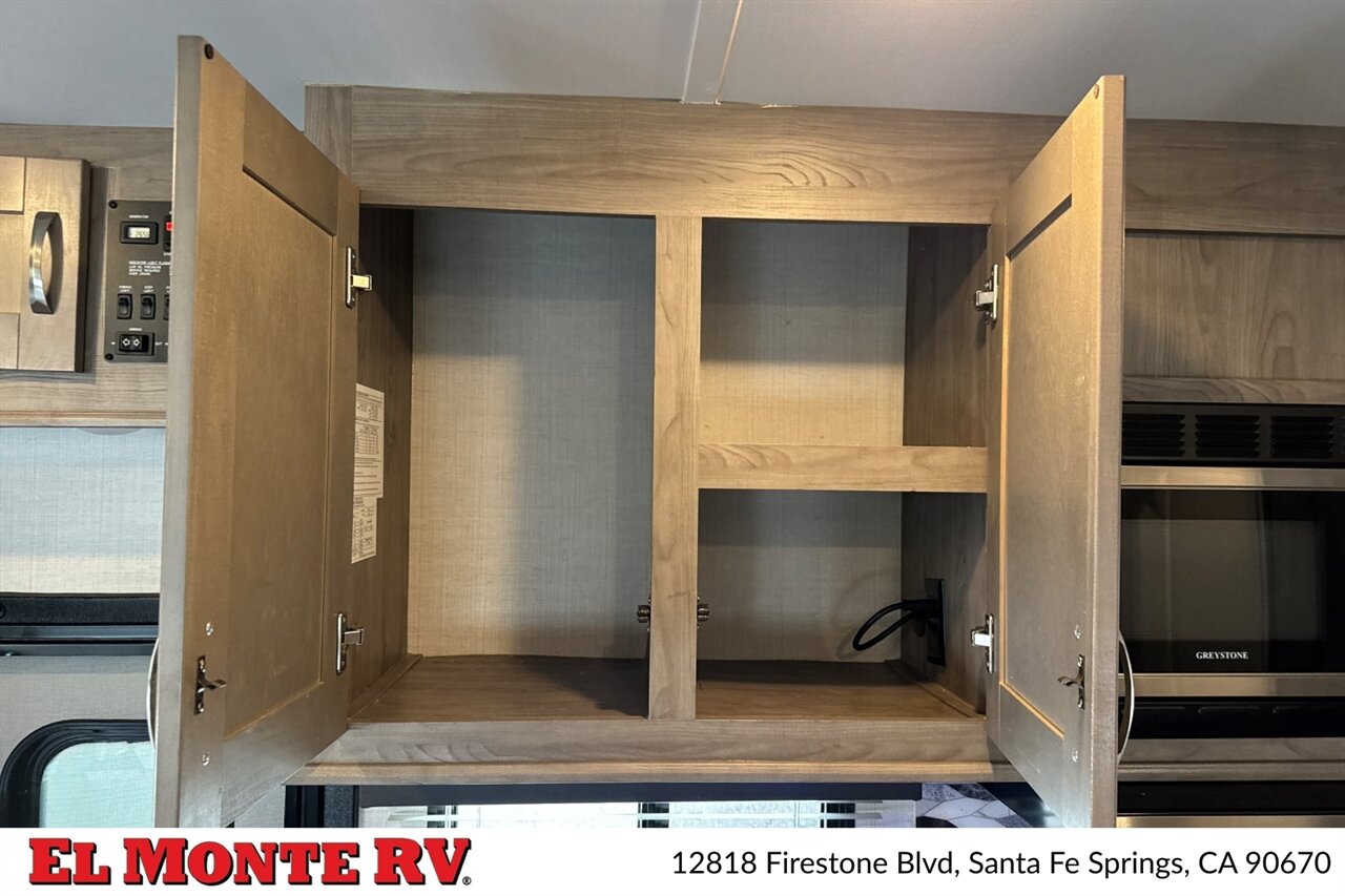 The fully equipped kitchen is a highlight of the Conquest 6238. It boasts a three-burner gas range, a spacious microwave, and a double-door refrigerator, allowing for convenient meal preparation and storage. Ample counter space, combined with a deep stainless-steel sink, makes cooking and cleanup a breeze. The kitchen is designed with overhead cabinets and drawers that provide plenty of storage for cookware, utensils, and pantry items.