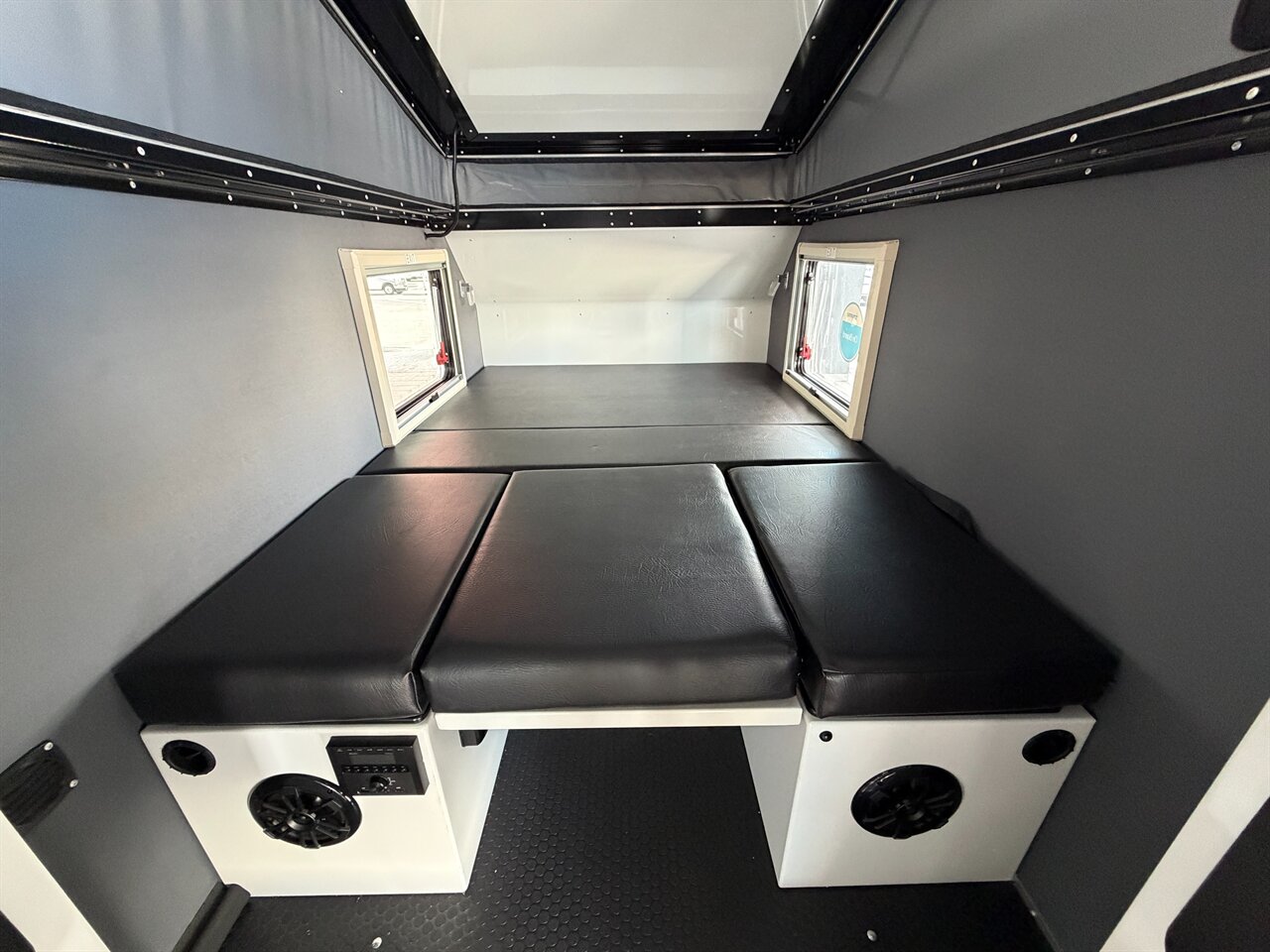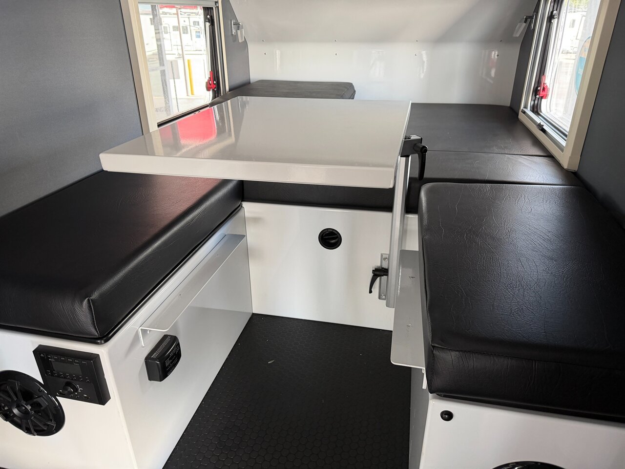 The main living area features a comfortable seating arrangement that can easily convert into a sleeping space, accommodating up to four individuals. High-density foam cushions provide excellent support, ensuring a restful night's sleep after a long day of adventure. Ample windows allow natural light to flood the interior, creating a bright and airy environment.