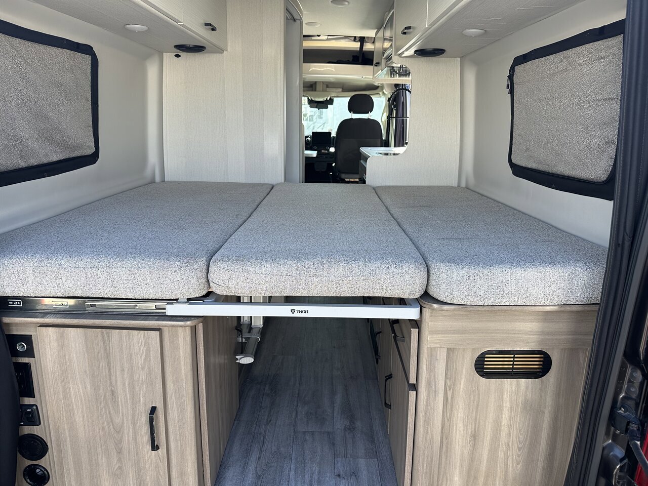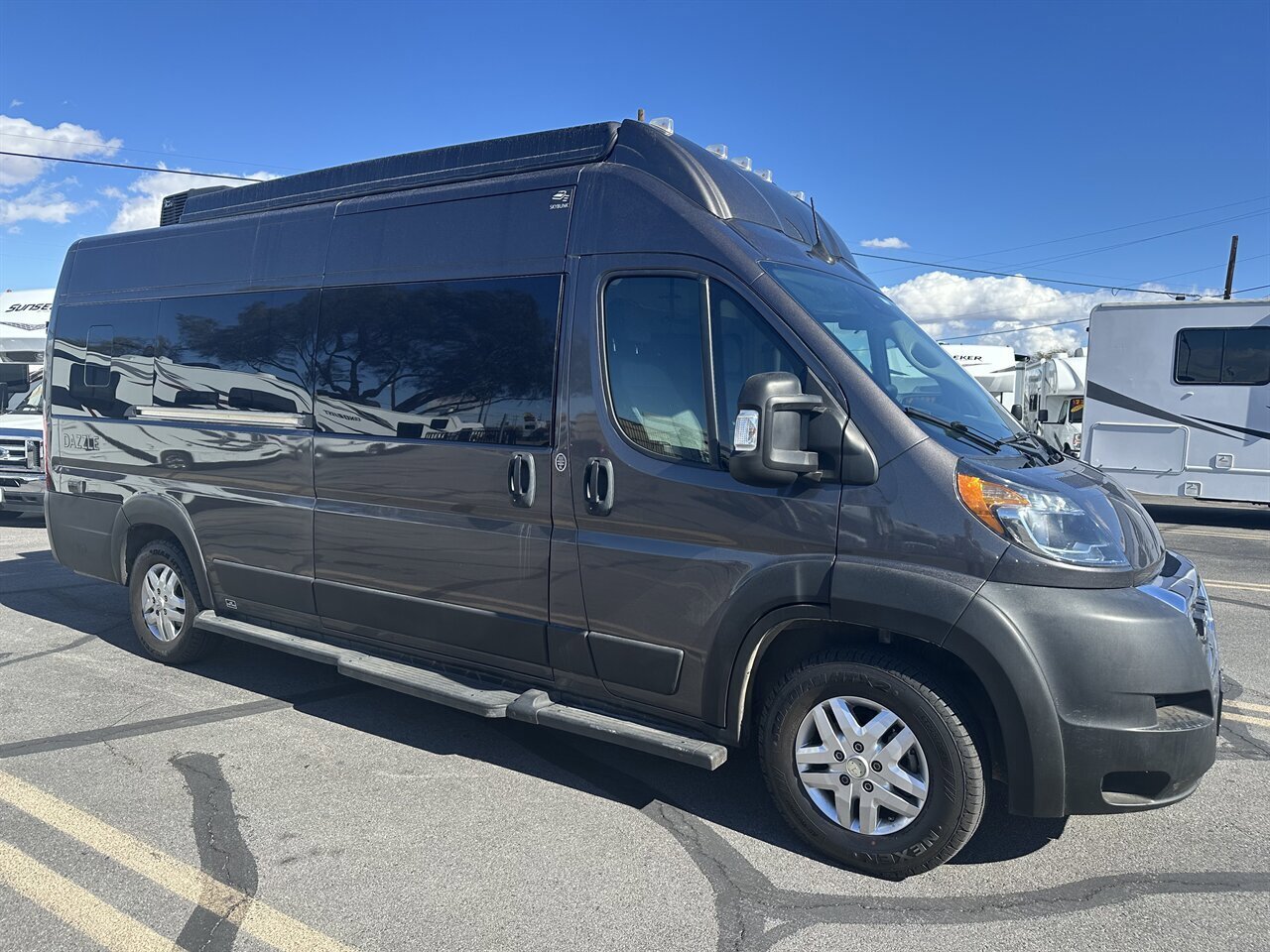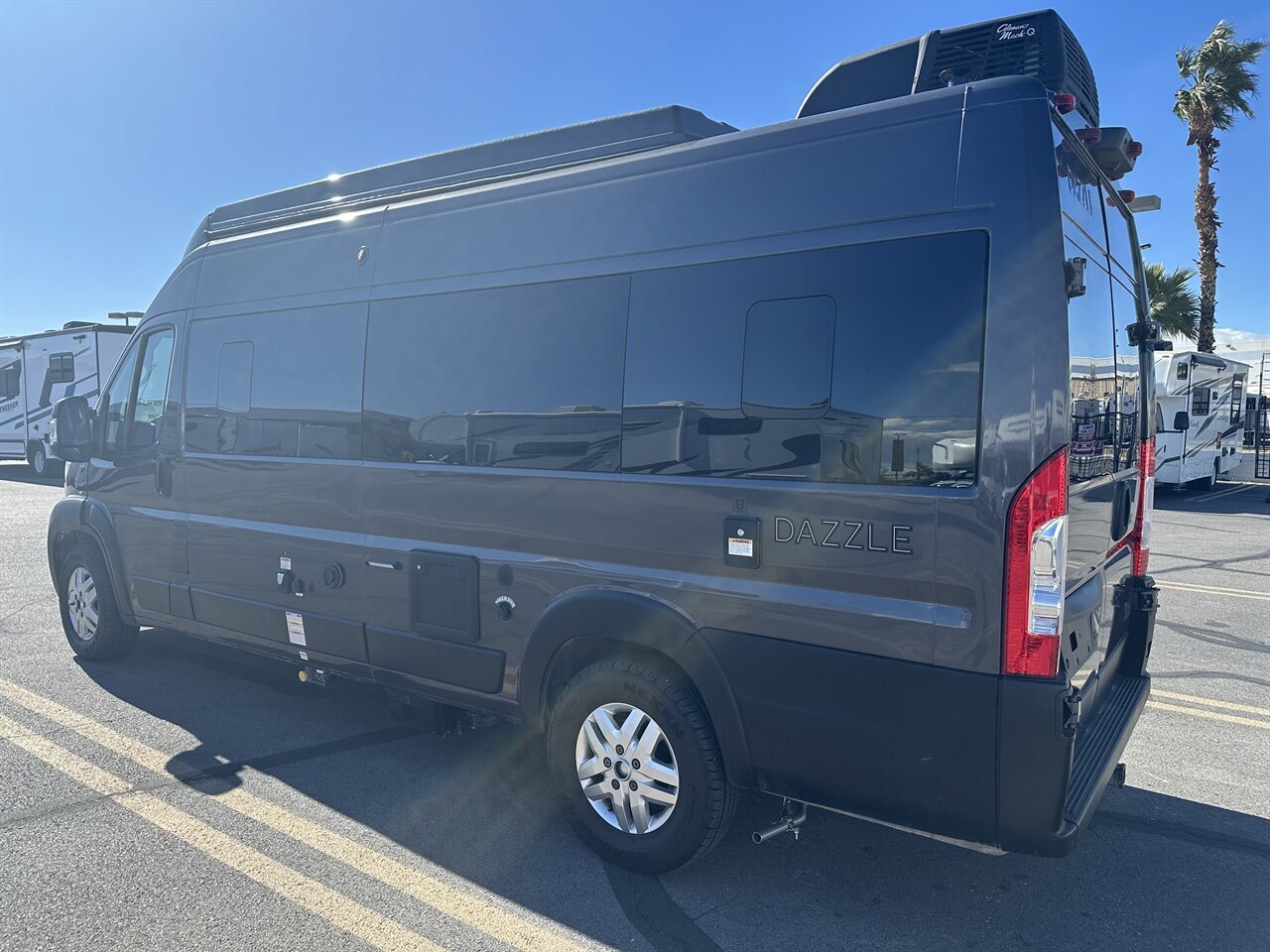 The 2024 Thor Dazzle 2AB is a Class B camper van built on a RAM ProMaster 3500 XT window van chassis, designed for efficiency and modern van life. Featuring an optional SkyBunk® rooftop sleeping area, this model accommodates up to 4 people with the extra space.Key Specifications (2024 Dazzle 2AB):Chassis: RAM ProMaster 3500Engine: 3.6L V6 Pentastar (276 hp, 250 ft-lb torque)Transmission: 9-speed AutomaticLength: 21 ft 1 inExterior Height: 9 ft 5 inInterior Height: 6 ft 3 inGVWR: 9,350 lbsFuel Capacity: 24 gal (Gasoline)Towing Capacity: 3,500 lbsSleeping Capacity: 4 (with optional SkyBunk)SkyBunk® and Layout DetailsOptional SkyBunk: A pop-up rooftop tent area that significantly expands sleeping capacity, allowing for a family van configuration (up to 4 people).Rear Bed: Features a pull-out rear king bed with optional twin bed configurations.Kitchen: Equipped with a two-burner gas cooktop, 12V refrigerator, microwave, and a pop-up power tower with outlets and wireless charging.Bathroom: A wet bath with a cassette toilet and a drop-down sink to optimize space.Climate/Power: Features a 11,000 BTU low-profile AC, 14,300 BTU Truma Combi furnace, and a 200-watt solar panel.Control System: Rapid Camp+® Multiplex wiring system.Key FeaturesDriving Aids: Includes a touchscreen dashboard, back-up monitor, and swivel captain's chairs.Outdoor Amenities: Rear screen door.ComforINSTALLED FEATURES: Air filtration, Front air conditioning, Front air conditioning zones: single, AirbagI