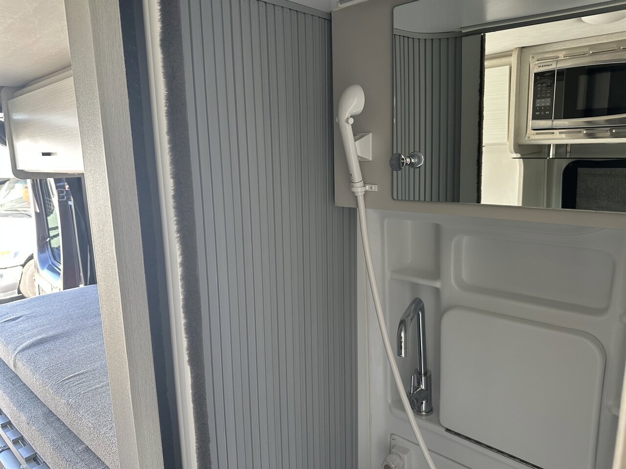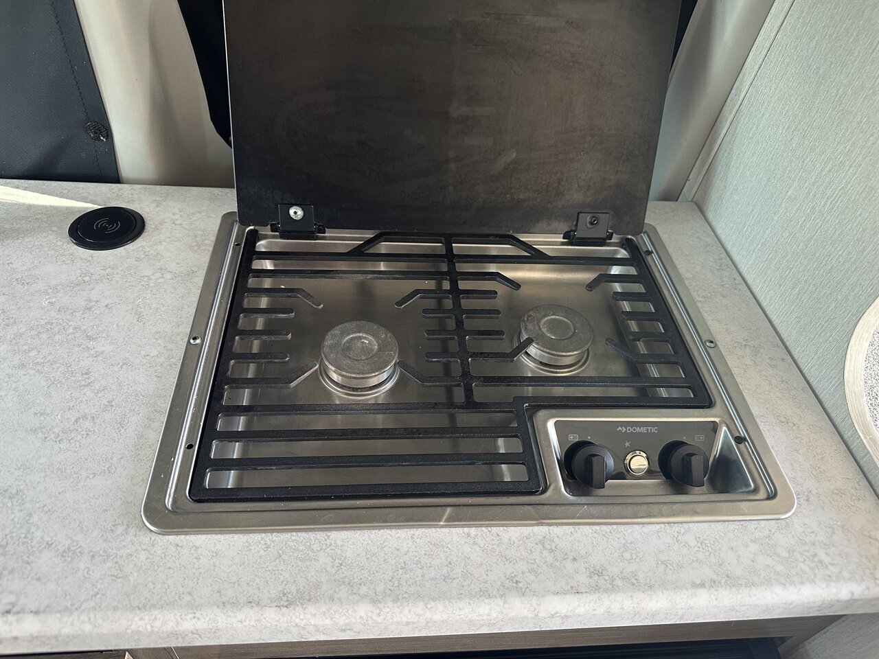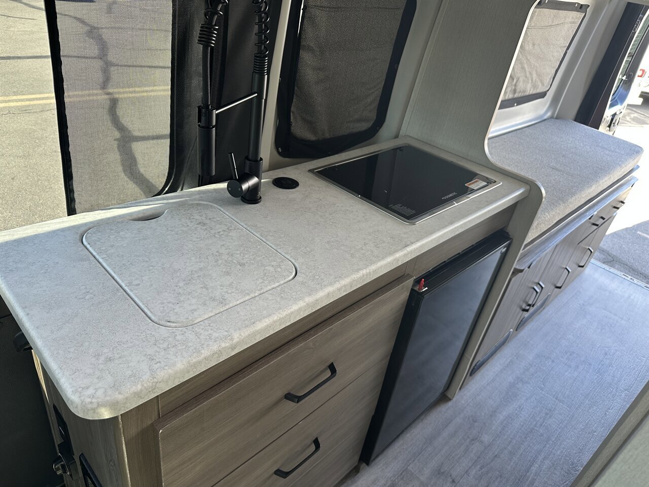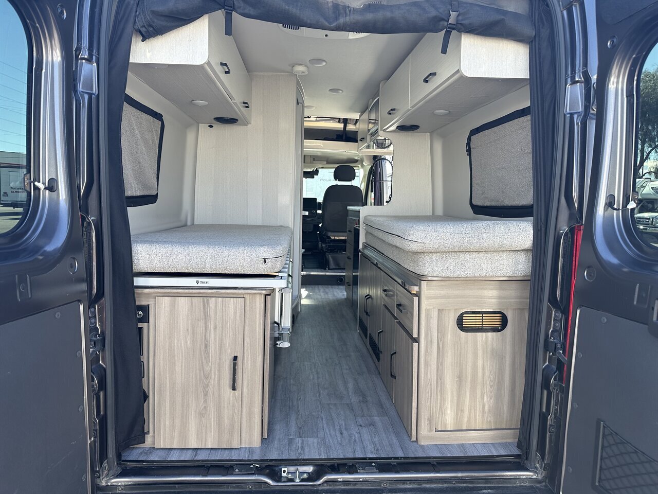The 2024 Thor Dazzle 2AB is a Class B camper van built on a RAM ProMaster 3500 XT window van chassis, designed for efficiency and modern van life. Featuring an optional SkyBunk® rooftop sleeping area, this model accommodates up to 4 people with the extra space.Key Specifications (2024 Dazzle 2AB):Chassis: RAM ProMaster 3500Engine: 3.6L V6 Pentastar (276 hp, 250 ft-lb torque)Transmission: 9-speed AutomaticLength: 21 ft 1 inExterior Height: 9 ft 5 inInterior Height: 6 ft 3 inGVWR: 9,350 lbsFuel Capacity: 24 gal (Gasoline)Towing Capacity: 3,500 lbsSleeping Capacity: 4 (with optional SkyBunk)SkyBunk® and Layout DetailsOptional SkyBunk: A pop-up rooftop tent area that significantly expands sleeping capacity, allowing for a family van configuration (up to 4 people).Rear Bed: Features a pull-out rear king bed with optional twin bed configurations.Kitchen: Equipped with a two-burner gas cooktop, 12V refrigerator, microwave, and a pop-up power tower with outlets and wireless charging.Bathroom: A wet bath with a cassette toilet and a drop-down sink to optimize space.Climate/Power: Features a 11,000 BTU low-profile AC, 14,300 BTU Truma Combi furnace, and a 200-watt solar panel.Control System: Rapid Camp+® Multiplex wiring system.Key FeaturesDriving Aids: Includes a touchscreen dashboard, back-up monitor, and swivel captain's chairs.Outdoor Amenities: Rear screen door.ComforINSTALLED FEATURES: Air filtration, Front air conditioning, Front air conditioning zones: single, AirbagI