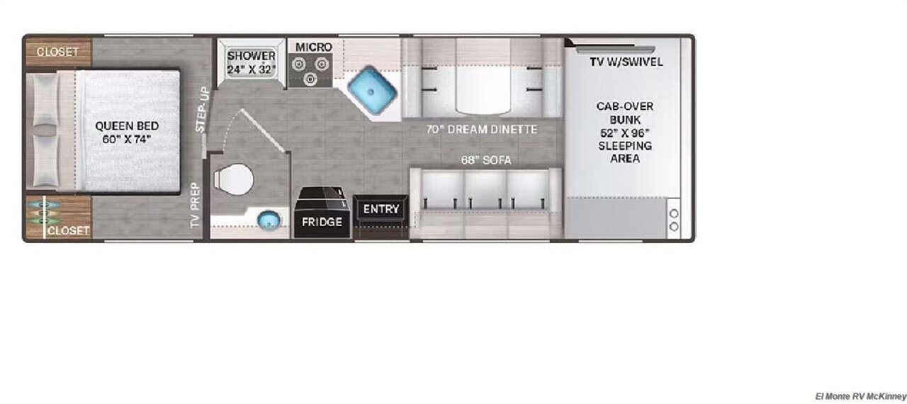 The fully equipped kitchen includes a large refrigerator, microwave, 3-burner cooktop, and ample counter space, making it easy to prepare meals on the go. A spacious bathroom with shower ensures convenience wherever your travels take you.