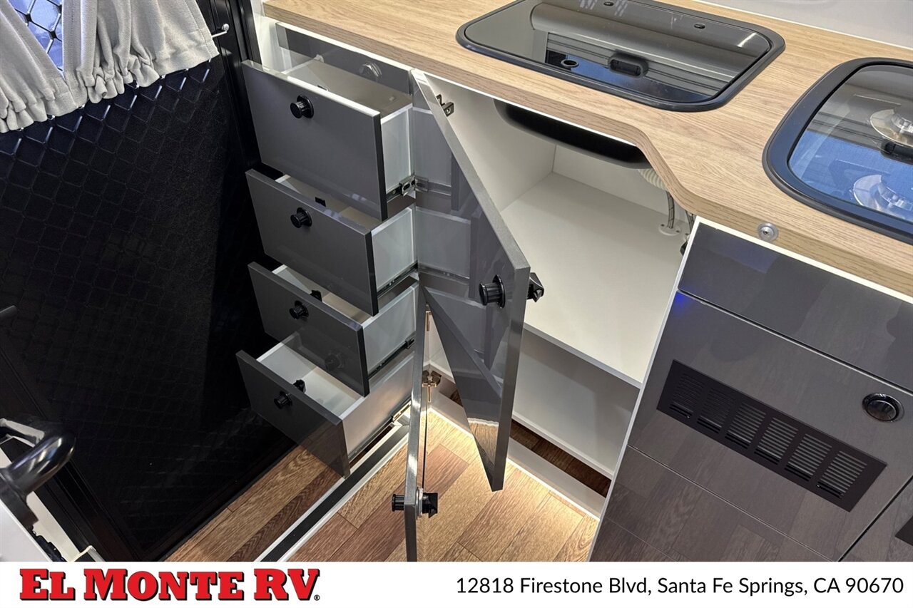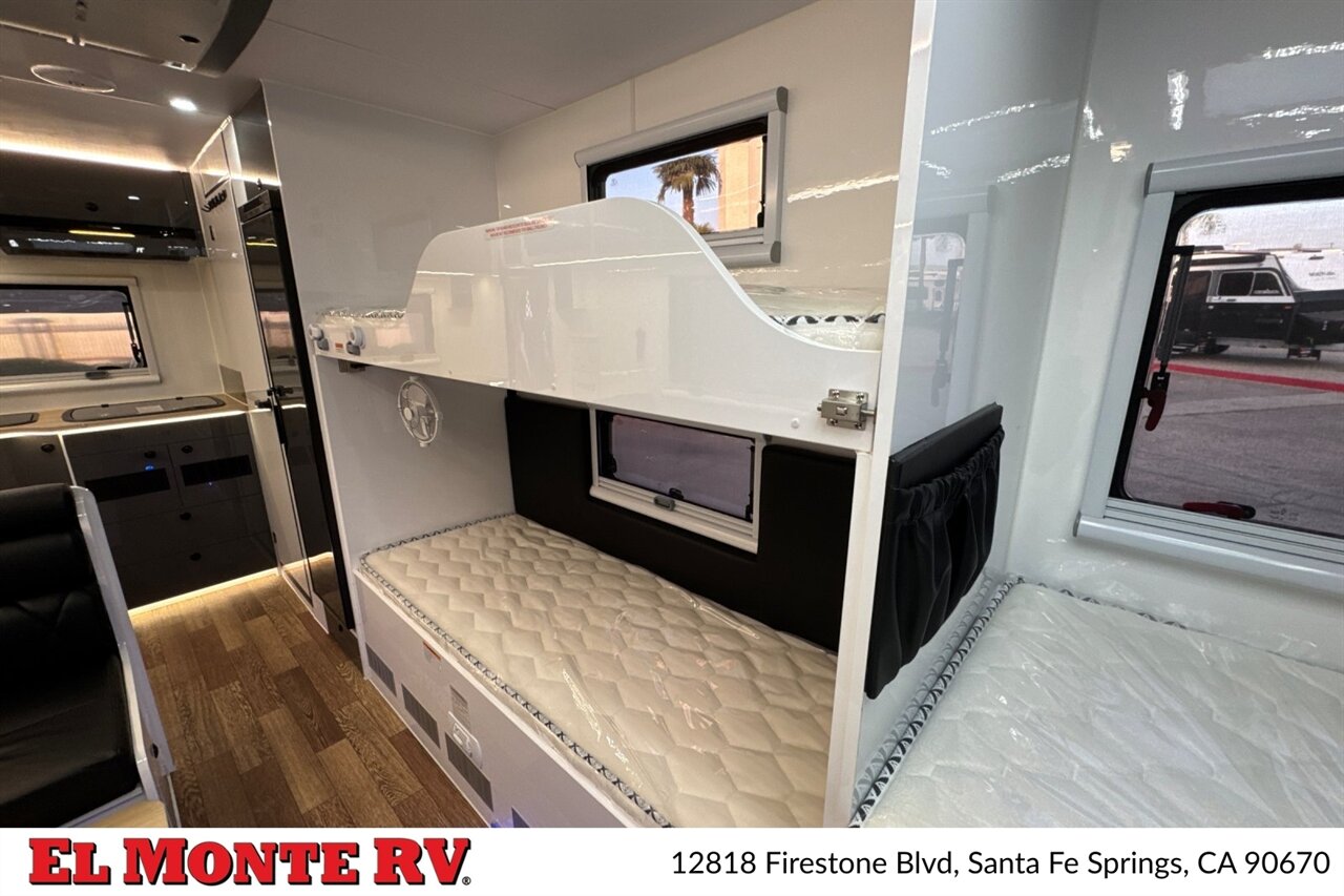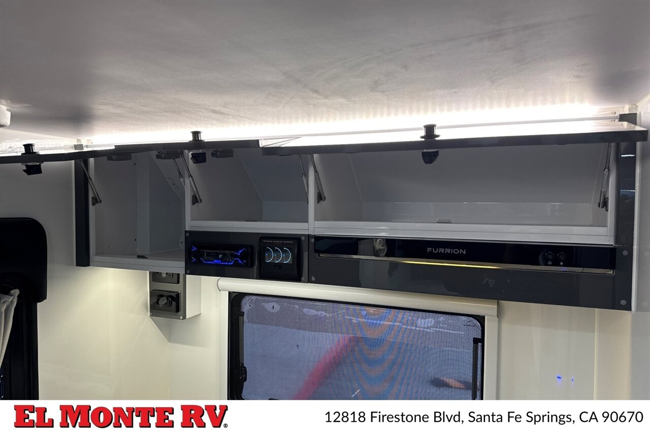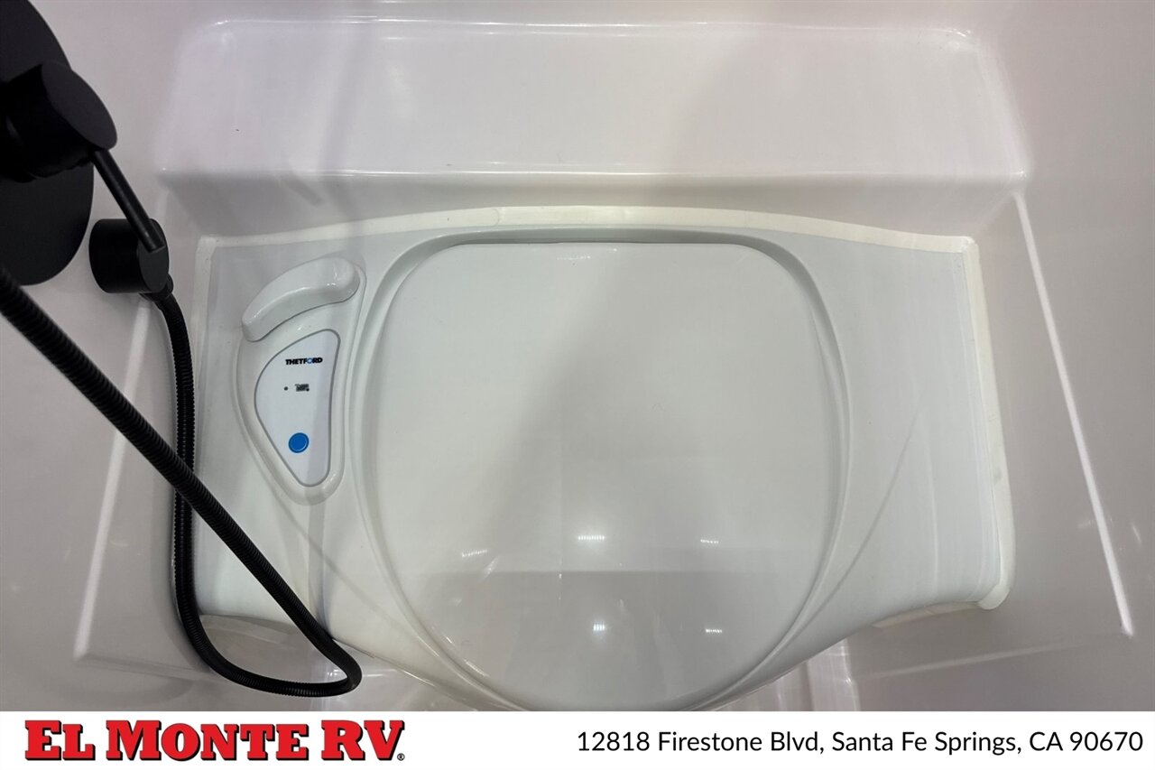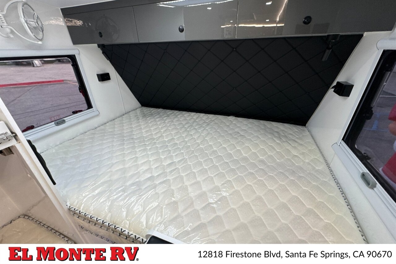 - Power and Utilities: 30-amp shore power inlet, battery disconnect switch, external cable/satellite hookup, and water service port. Pre-wired for solar (factory solar prep) with dedicated panel mounting points and an inverter compartment.