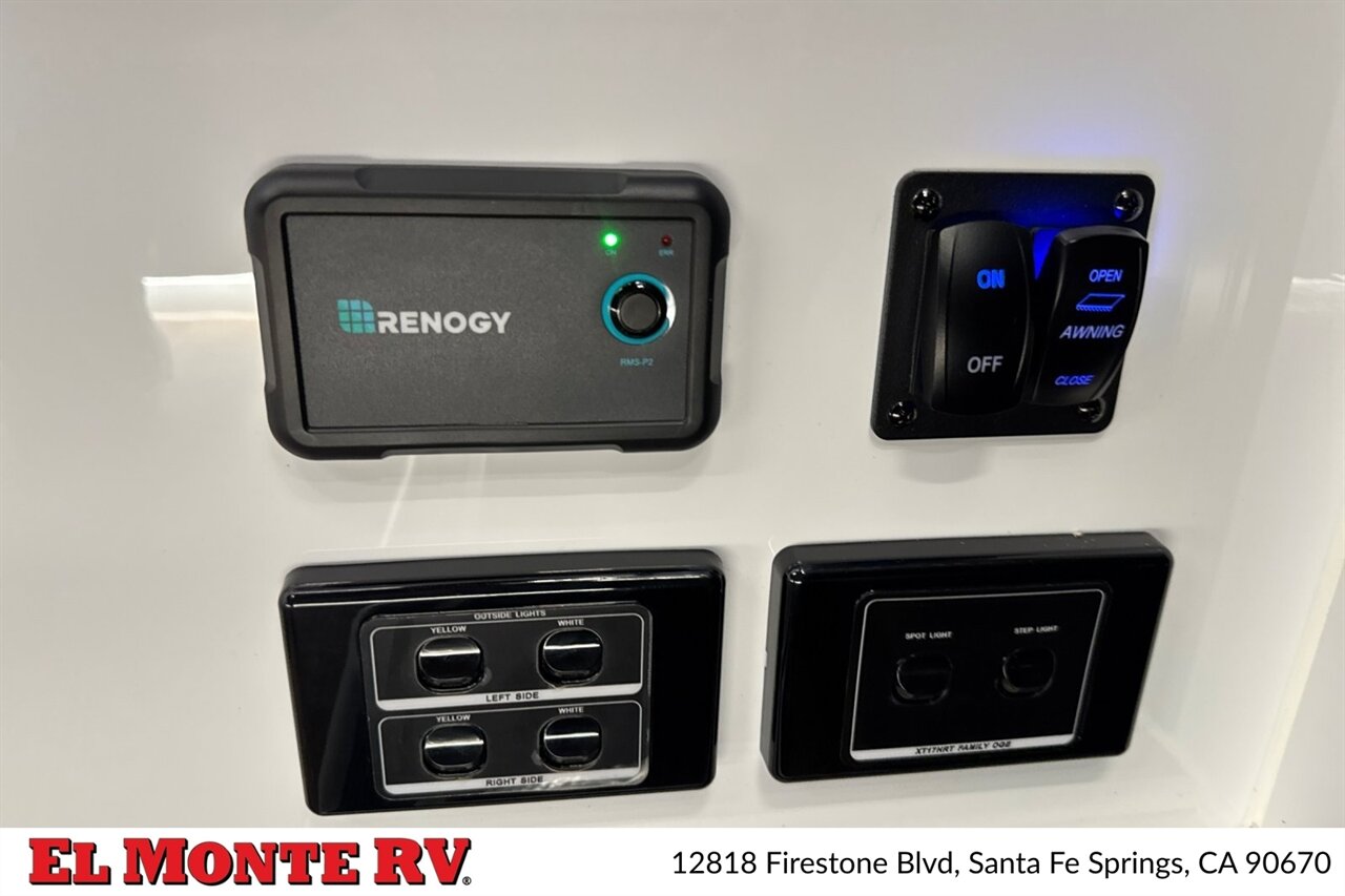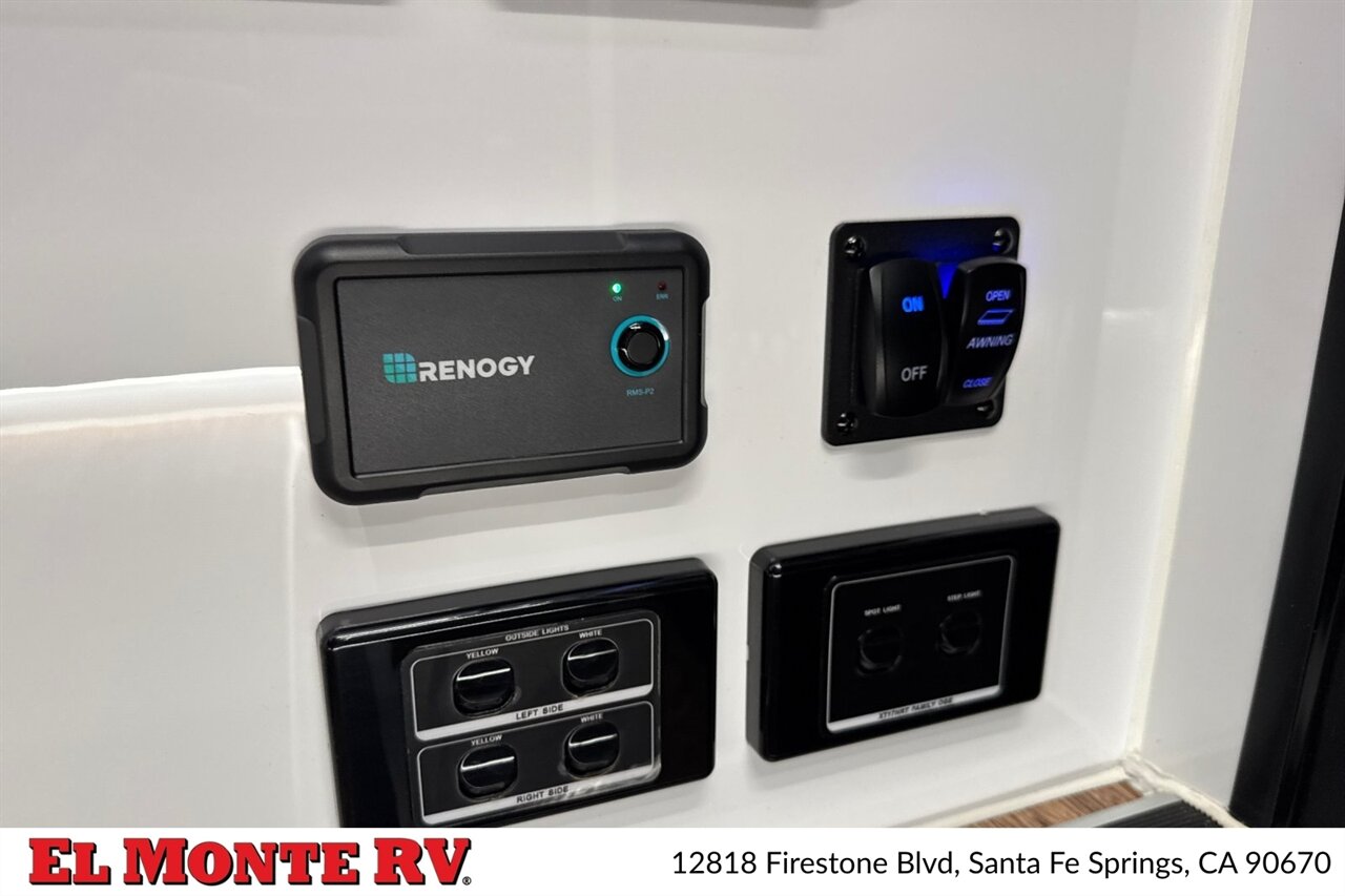 - Outdoor Living: Power-retractable awning with integrated LED lighting and manual wind-limiting. Exterior speakers tied to the interior audio system and a convenient outdoor shower with hot and cold water connections for cleanup and pet care.