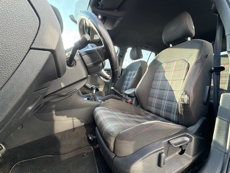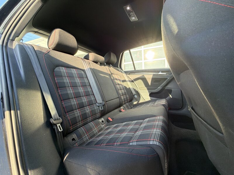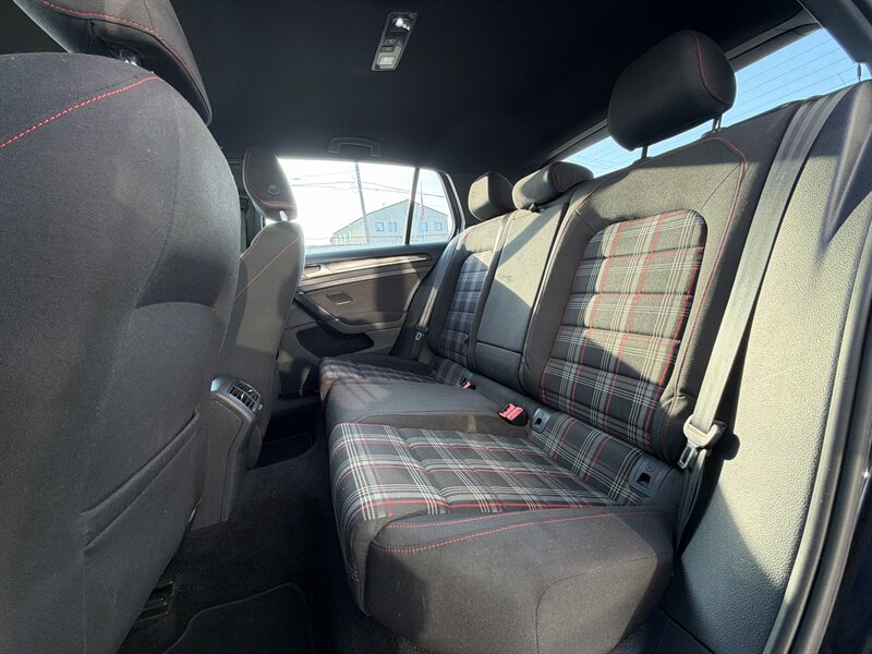- The cabin delivers a sporty yet comfortable environment with bolstered front seats featuring the iconic GTI cloth inserts, a leather-wrapped steering wheel with red contrast stitching and GTI emblem, and a driver-focused cockpit. The rear seats fold 60/40 for flexible cargo space, and thoughtful touches like a leather/metal-trimmed shift knob and sporty aluminum-look pedals emphasize the performance character.
