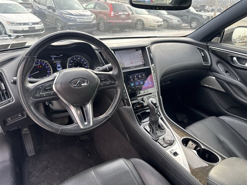- Exterior features: Sculpted coupe styling with sleek LED accent lighting and a bold grille, aerodynamic lines, and premium alloy wheels straight from the factory that complement the Q60’s athletic stance.