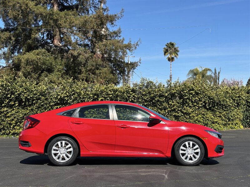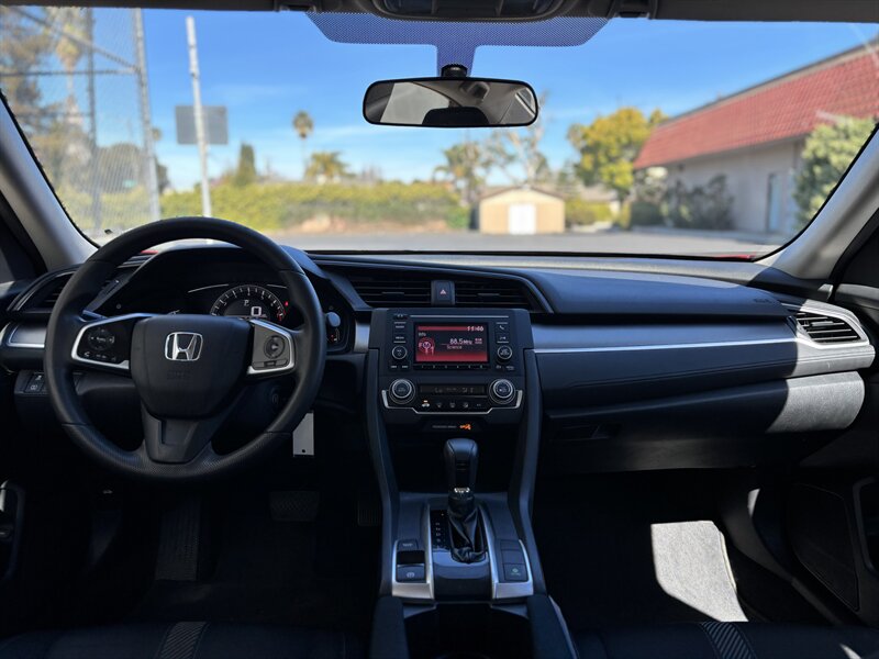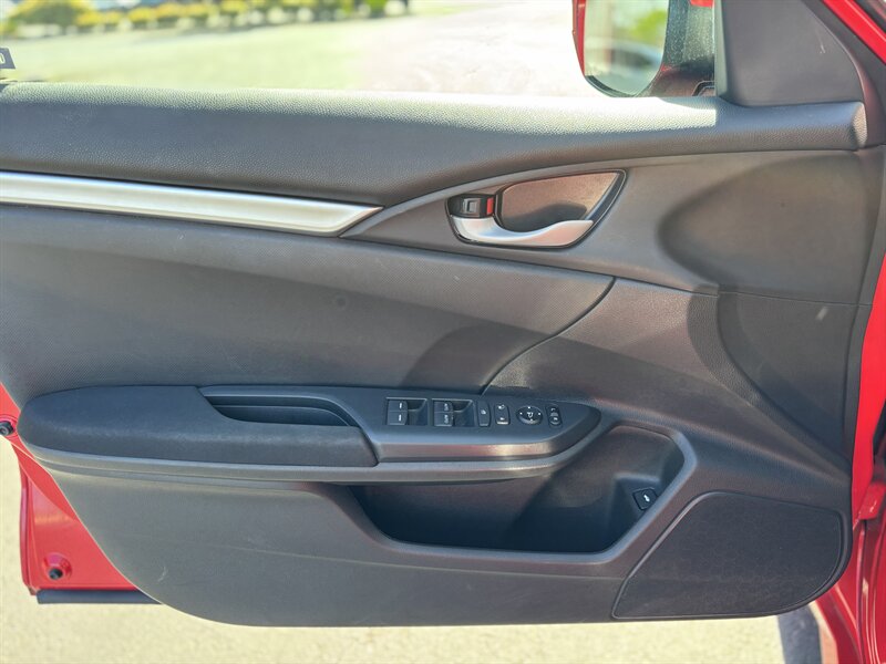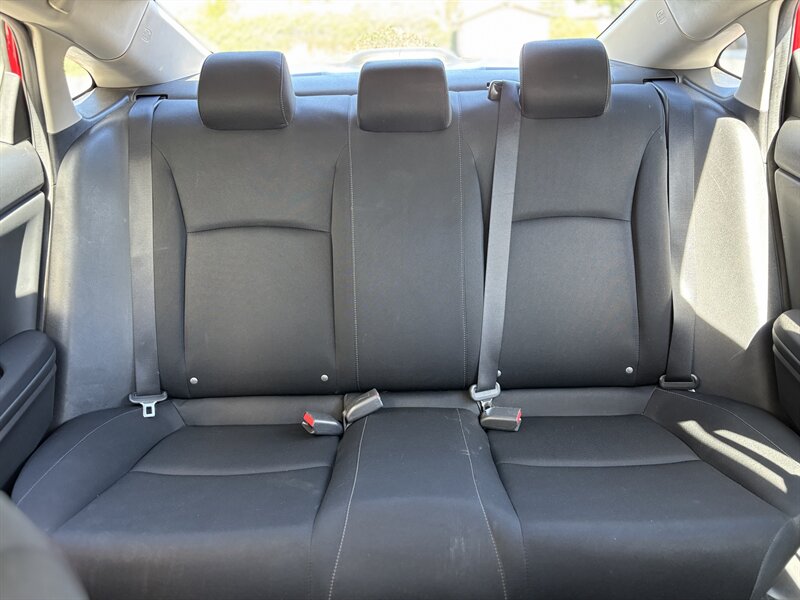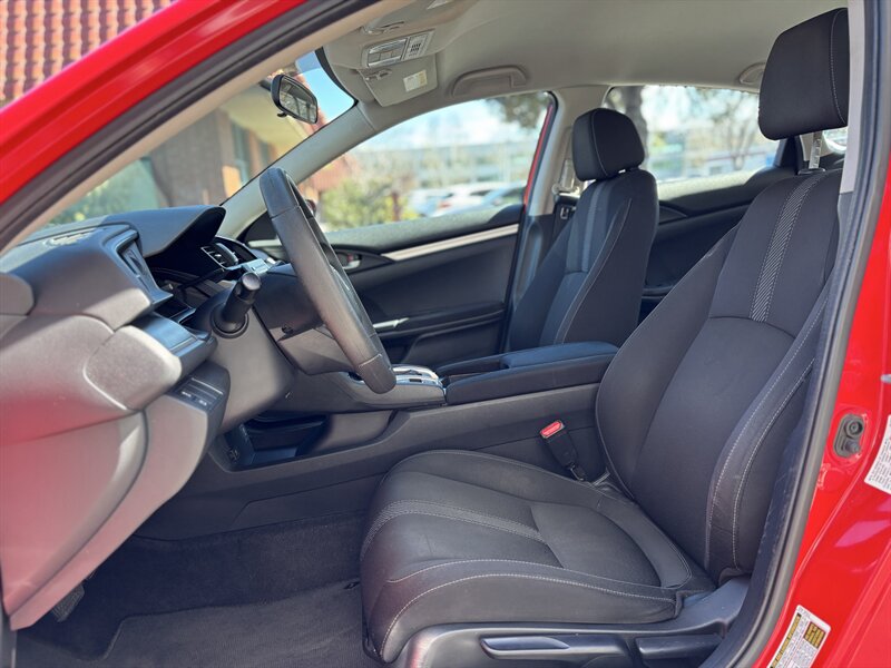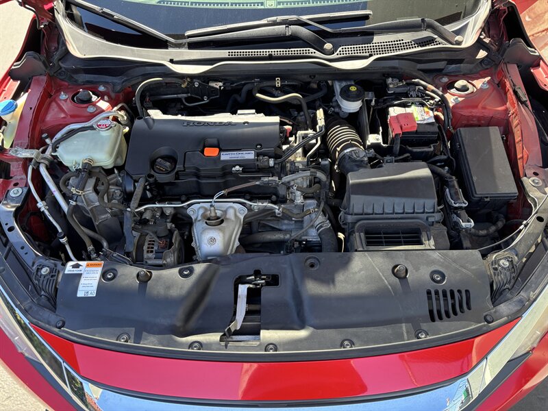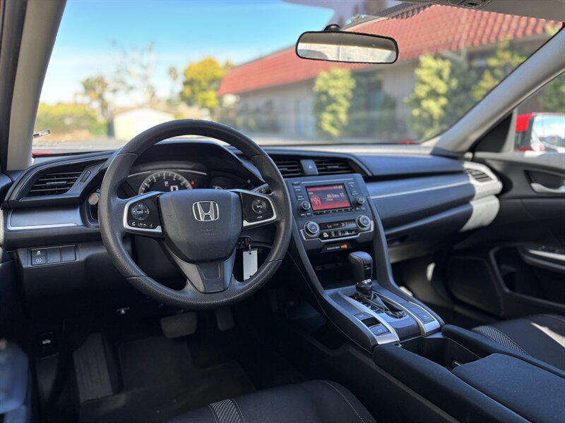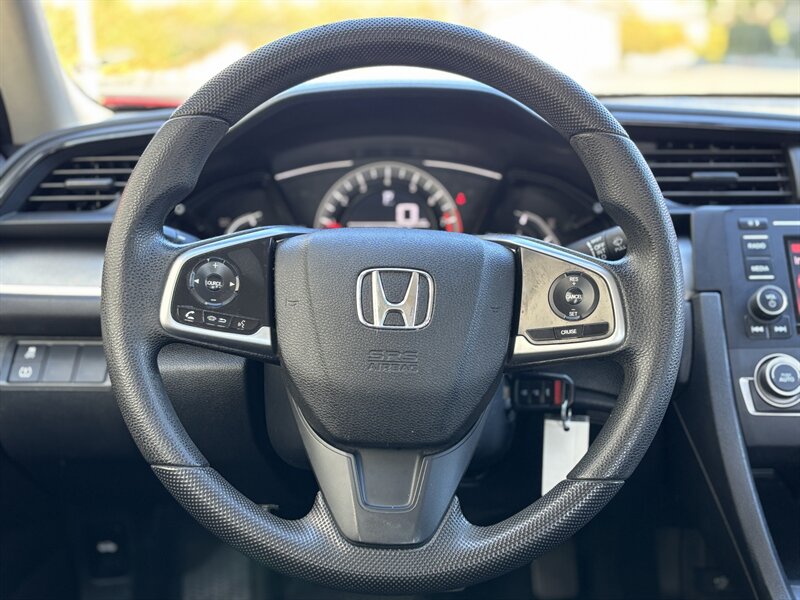 2017 Honda Civic LX — exterior Rallye Red con interior de tela negra. Impulsado por un motor 2.0L I4 (158 hp, 138 lb-ft) acoplado a una suave transmisión CVT, este Civic ofrece excelente economía (31 MPG en ciudad / 40 MPG en carretera) y tiene menos de 65,000 millas (aprox. 7,000 millas/año). De fábrica incluye asientos de tela para cinco con respaldo trasero abatible 60/40, aire acondicionado, control de crucero, volante inclinable/telescópico, ventanas y seguros eléctricos con entrada remota sin llave, Bluetooth manos libres y reproducción de audio, entrada USB, controles de audio en el volante, radio AM/FM, cámara trasera multiángulo, ABS con control de tracción y Vehicle Stability Assist, bolsa(s) de aire completas, Sistema de Monitoreo de Presión de Neumáticos, faros halógenos y rines de acero de 16" con tapas. El vehículo está en excelente condición general — confiable, eficiente y listo para disfrutar.