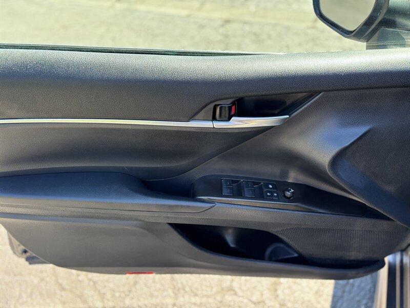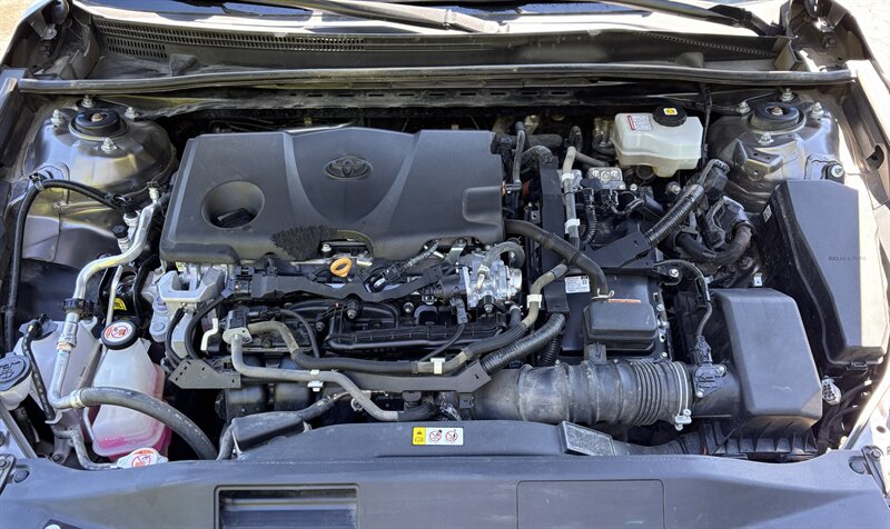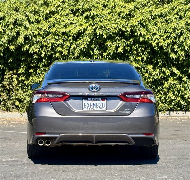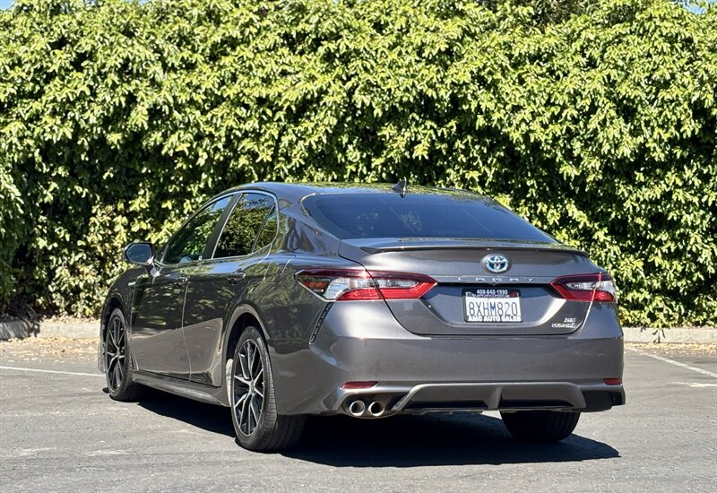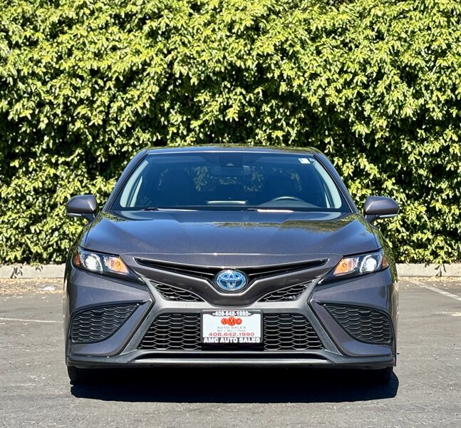 2021 Toyota Camry Hybrid SE in Predawn Gray Mica with a Black interior — powered by a 2.5L Hybrid I4 producing 208 hp and rated 44 MPG city / 47 MPG highway. This vehicle is in excellent overall condition and offers crisp, efficient performance with a sporty feel. Factory features include Toyota Safety Sense 2.5+ (Pre-Collision System with pedestrian detection, Dynamic Radar Cruise Control, Lane Departure Alert with Steering Assist, Lane Tracing Assist, Road Sign Assist, and Automatic High Beams), LED headlights and daytime running lights, sport-tuned suspension with 18" alloy wheels, smart key with push-button start, power windows/locks, dual-zone automatic climate control, touchscreen infotainment with Apple CarPlay/Android Auto, Bluetooth and USB connectivity, backup camera, ABS, traction and stability control, and comfortable sport seats in Black.